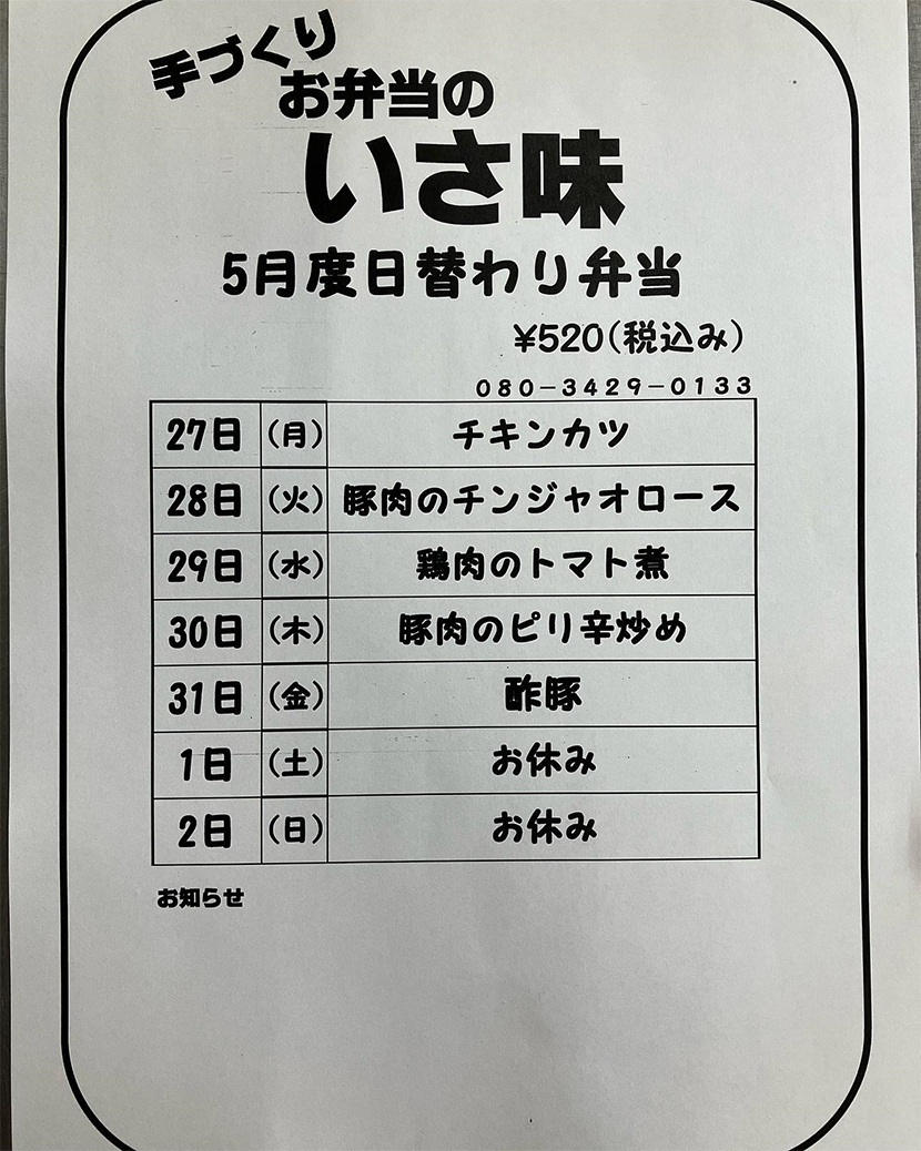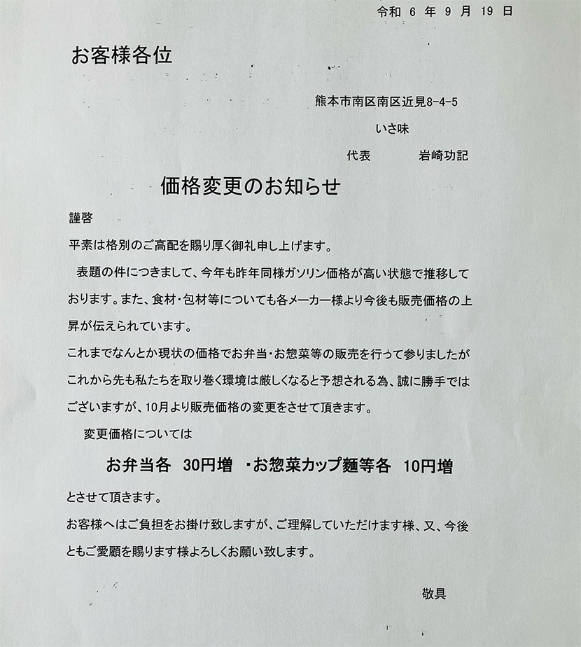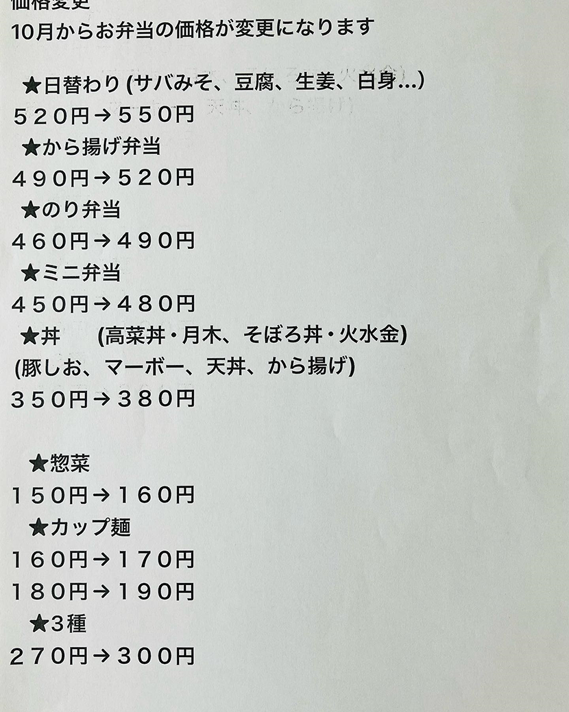 これまでなんとか現状の価格でお弁当・お惣菜等の販売を行ってまいりましたがこれから先も私たちを取り巻く環境は厳しくなると予想される為、誠に勝手ではございますが、10月より販売価格を変更させて頂きます。