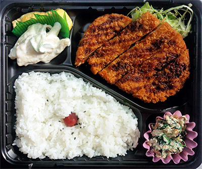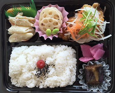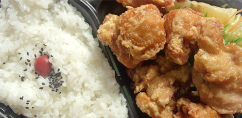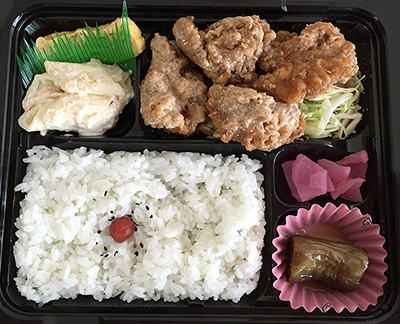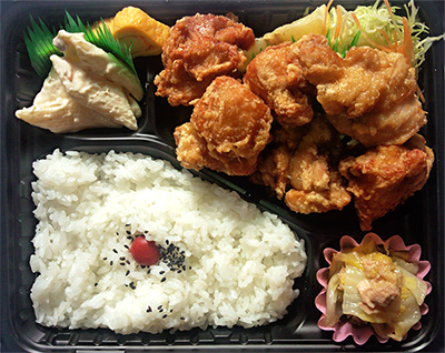 人気のから揚げにゴマのたれをからませたお弁当です。