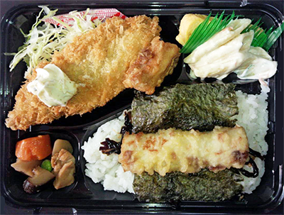 白身魚のフライにちくわの天ぷらをのせたのり弁当です。